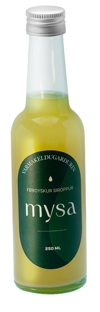 Vit valdu at presentera siroppin í einari glasfløsku – ásannandi, at siroppur ikki er ein gerandisvøra tú keypir. Etikettin varð gjørd í tveimum grønum litbráðum, sum riggaðu væl saman við gulliga siropplitinum. Heitið, vit góvu siroppinum, varð heilt einfalt: Mysa – føroyskur siroppur.